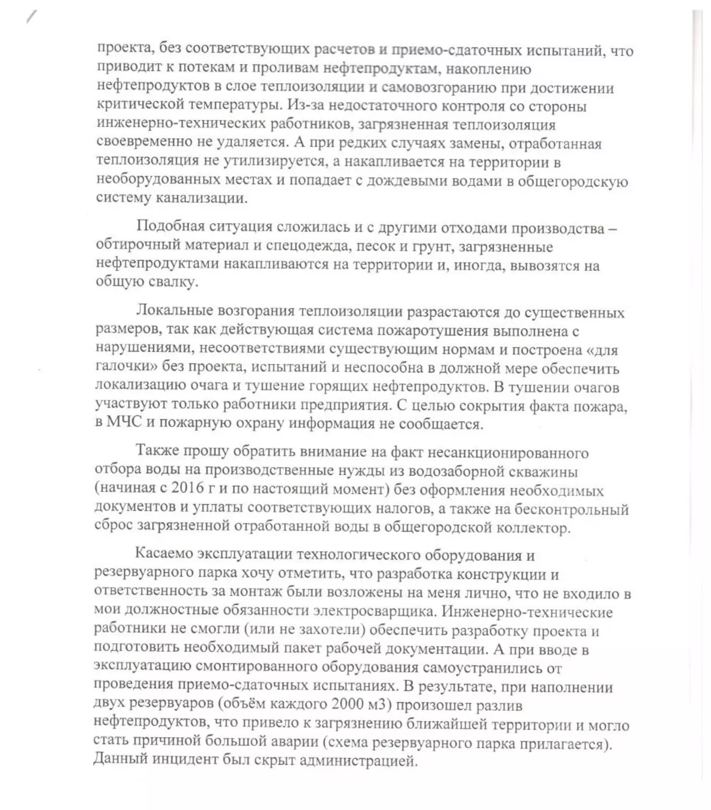 «Собираются строить новую ёмкость на 2500 кубометров, при этом ни один сварщик не прошел аттестацию. Нужно варить образцы на производство этих емкостей, но никто этого не делает. Более того, резервуары, в которые заливается битум — не оборудованы системой перелива и уровень наполнения емкостей меряется палочкой или рулеткой. Иногда битум поднимается вверх и через воздушную трубу течёт на землю, загрязняя окружающую среду. Потом этот битум собирают и отвозят на свалку», — резюмирует Ткаченко.
