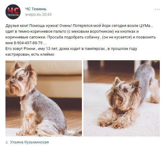 Накануне жительница Тюмени разместила сообщение о пропаже своего питомца в группе «ЧС Тюмень» в соцсети «ВКонтакте».