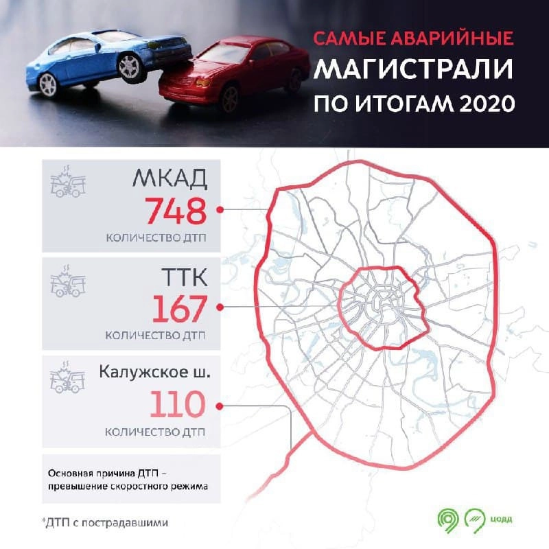 А вообще главной причиной ДТП и основным фактором смертей на дорогах является превышение скорости. Особенно это заметно по той же МКАД, где самый высокий скоростной режим в городе — до 100 км/час.