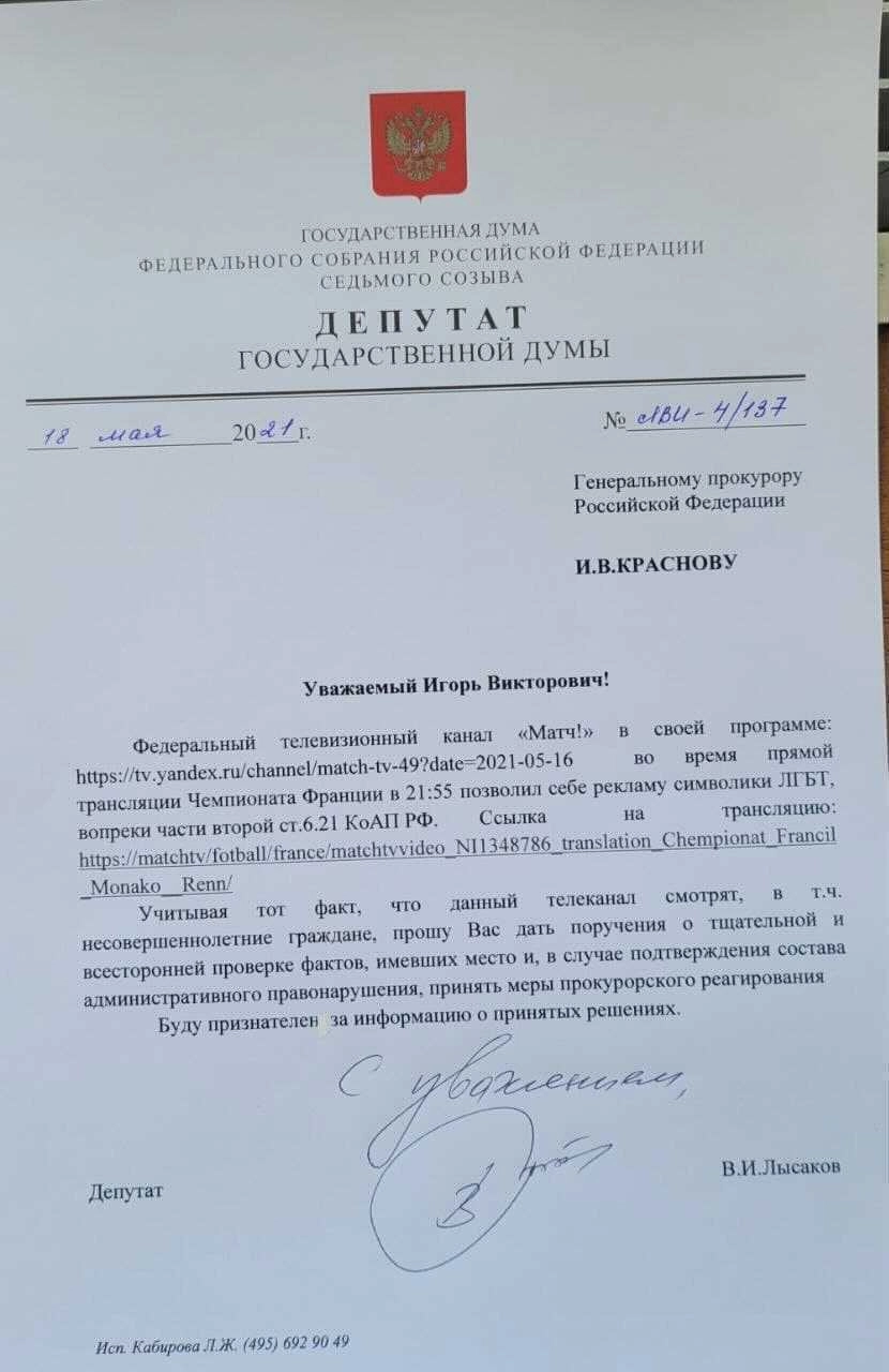 В обращении, которое законодатель отправил генеральному прокурору России Игорю Краснову, он призывал надзорное ведомство проверить факт появления ЛГБТ-символики на экране во время трансляции федеральным спортивным каналом одной из игр чемпионата Франции по футболу — ведь соревнования могли смотреть и несовершеннолетние.