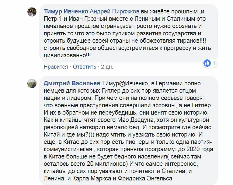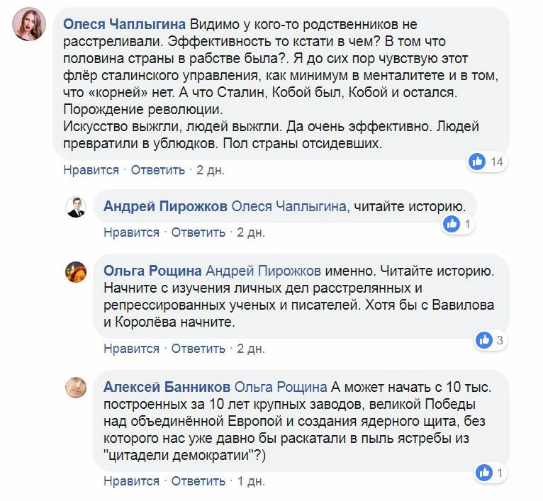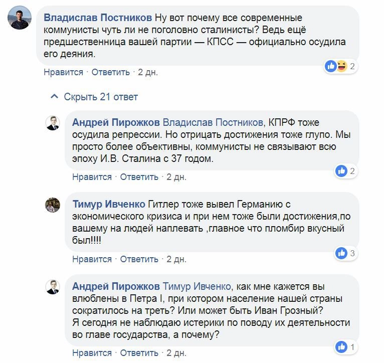 Пост Андрея Пирожкова предсказуемо вызвал бурную реакцию. Некоторым из критиков он ответил в комментариях в том смысле, что историю России и ее правителей надо оценивать трезво, но с уважением и признанием их заслуг, и Сталин не является исключением. У этой точки зрения нашлось немало сторонников, хотя отрицательные отзывы на заявление Пирожкова преобладали.