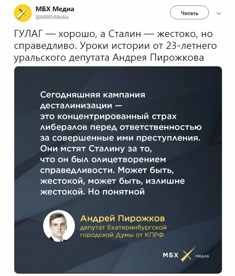 Депутат гордумы Екатеринбурга 24-летний Андрей Пирожков оказался в центре общественного внимания, заявив, что сталинские репрессии были неизбежны, потому что в то время у высшего руководства СССР просто не было другого способа решить стоявшие перед страной сложнейшие задачи. Особенный интерес вызвало противопоставление Пирожковым фигуры Сталина как «олицетворения справедливости» ныне живущему поколению «либералов».