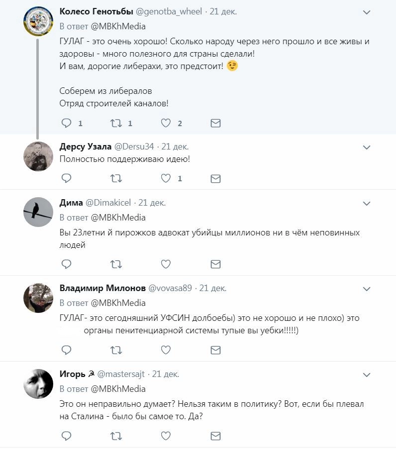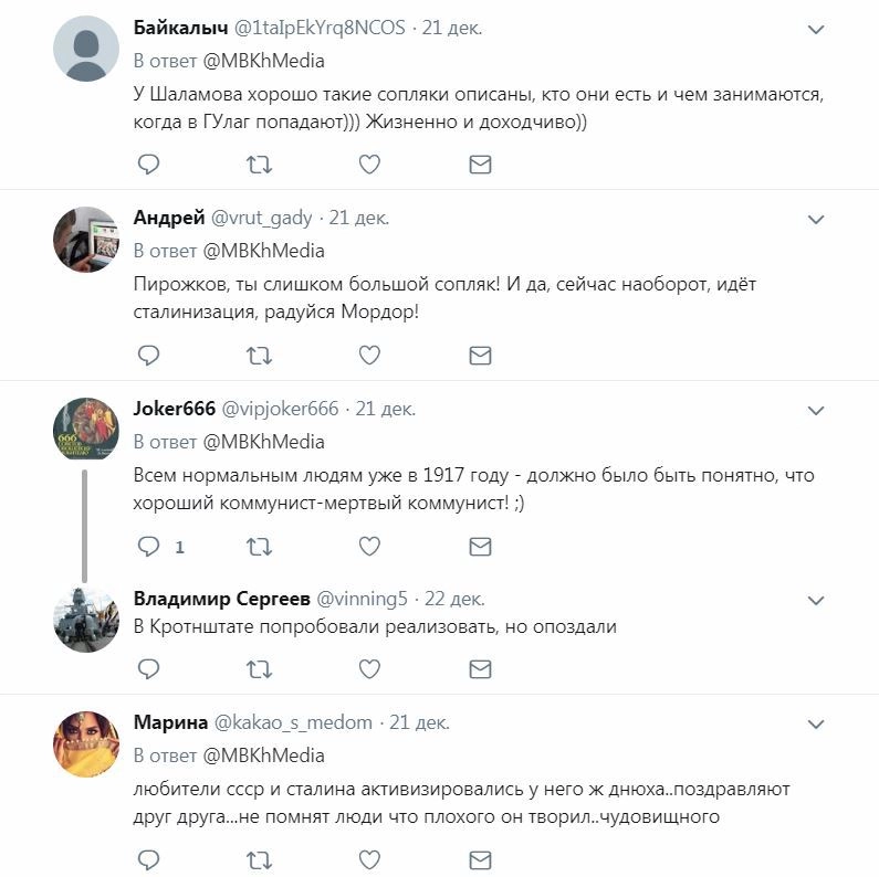 «Я считаю, что сегодняшняя компания десталинизации — это концентрированный страх либералов перед ответственностью за совершенные ими преступления. И ничего больше. Они мстят Сталину за то, что он был олицетворением справедливости. Может быть, жестокой, может быть, излишне жестокой. Но понятной», — написал Пирожков в Facebook.