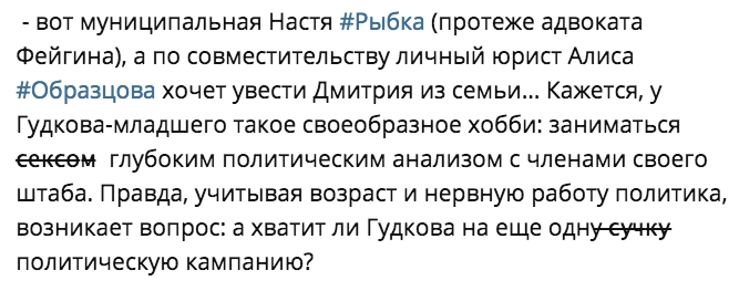 Гудков-младший, очевидно, также по-достоинству оценил деловую хватку, богатый жизненный опыт и другие прелести Алисы. В результате старательная девушка получила новые корочки — на этот раз муниципального депутата. А также полное финансирование своей избирательной кампании, материальную поддержку и бесценный опыт. Учитесь, дамы. Осторожно, двери закрываются, следующая станция — «Мосгордума», — иронизируют в соцсетях.
