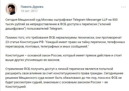 В марте 2018 года Роскомнадзор потребовал от Telegram в течение 15 дней передать ФСБ ключи дешифровки сообщений пользователей. Верховный суд РФ признал это требование законным.