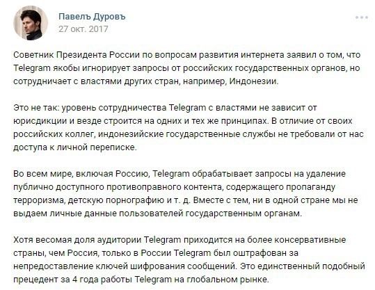 В июле 2017 года ФСБ России отправила основателю и генеральному директору мессенджера Павлу Дурову запрос о необходимости предоставления информации для декодирования сообщений с шести номеров, которые использует Telegram, со сроком исполнения до 19 июля. Дуров не стал сотрудничать со спецслужбами, так как, по его мнению, подобный шаг подорвет доверие пользователей.