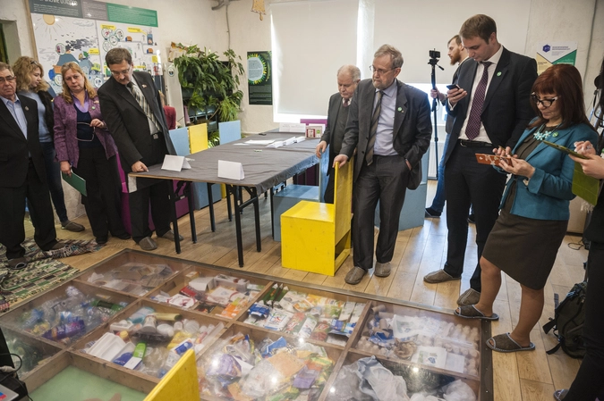 Встреча началась с экскурсии по центру, на первом этаже которого находится «пункт приёма полезных вещей», где на безвозмездной основе принимают вторсырье - макулатуру, стеклянную, алюминиевую, жестяную, пластиковую и Тетра Пак упаковку, а также батарейки и аккумуляторы. Здесь принимают только чистую тару, отмытую от органических отходов, что позволяет соблюдать чистоту и приятный запах, работает девушка-сортировщик, и посетителей просят проявлять сознательность и участие - заменять заполненные мешки, самим рассортировывать разные виды пластика по отдельным урнам. Активисты признают свой пункт образцовым и сообщают депутатам, что большинству пунктов, чтобы работать не в убыток, приходится пренебрегать такими принципами, и основными их клиентами становятся пенсионеры или бездомные, собирающие мусор на улицах.