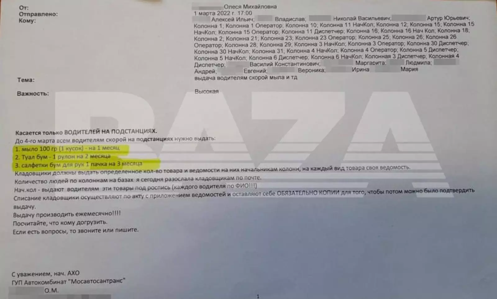 Ранее Telegram-канал Baza сообщил, что сотрудникам автокомбината, подведомственного департаменту здравоохранения, выдали «тринадцатую зарплату» наборами средств личной гигиены — мылом, туалетной бумагой и салфетками. Канал опубликовал снимок документа за подписью начальника хозяйственного отдела «Мосавтосантранса», в котором шла речь об этом, и видеообращение от имени работников автокомбината.
