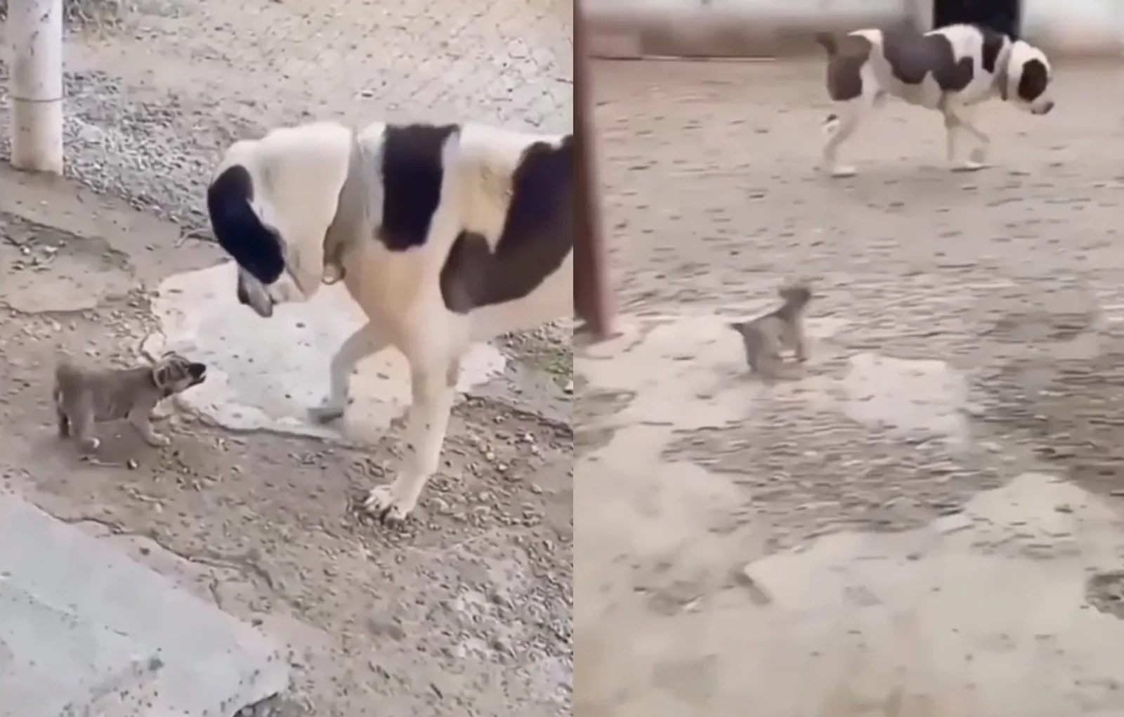 Дерзкий микроб: крошечный щенок запугал огромного пса