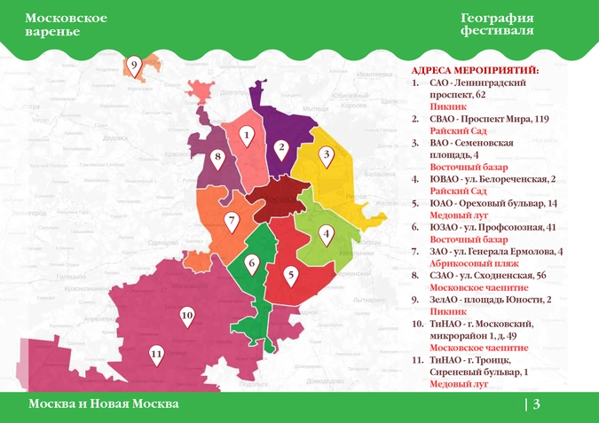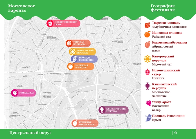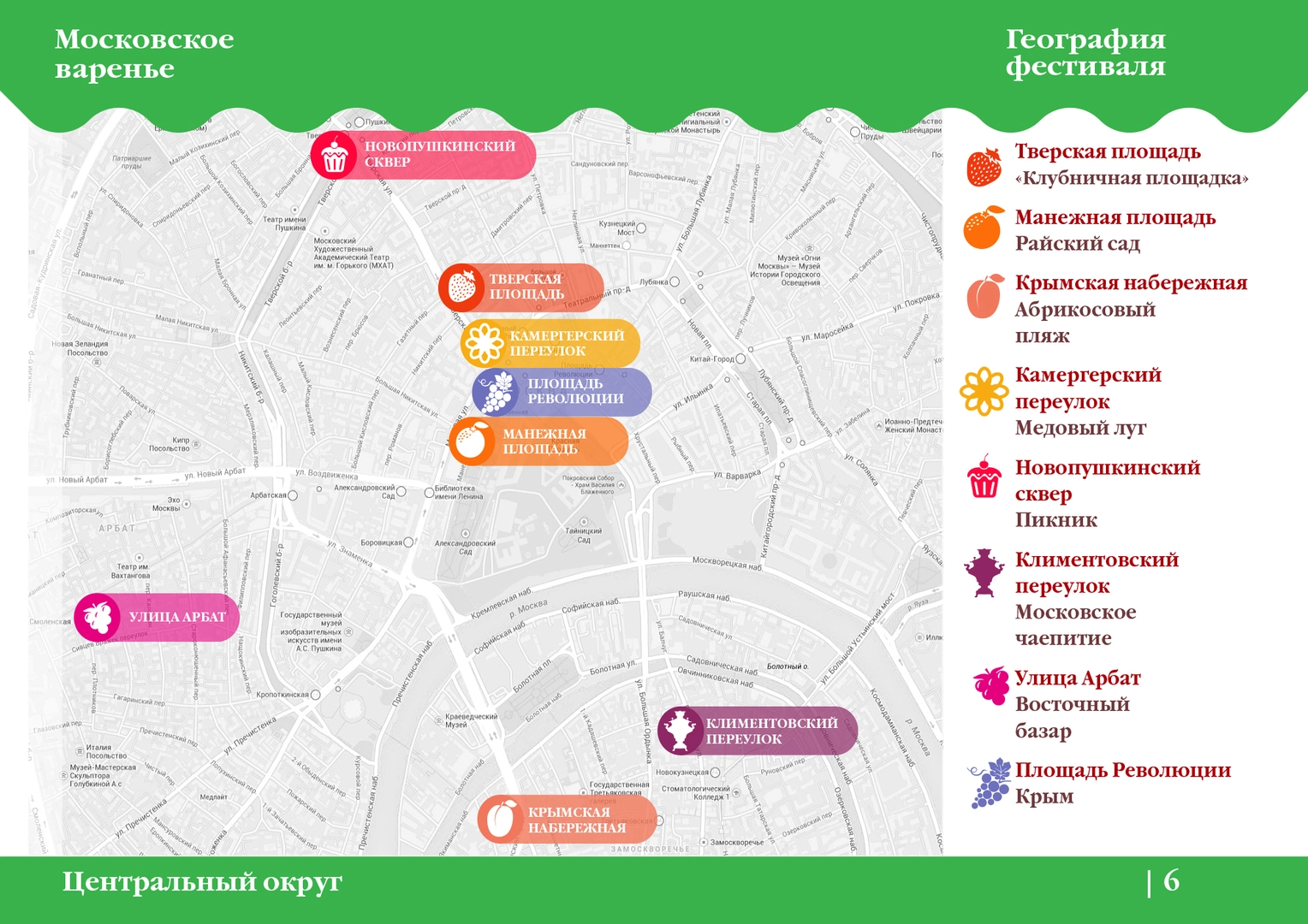 Фестиваль охватит весь город: 19 площадок во всех столичных округах захлестнет фруктовая волна. В центре это будут Тверская и Театральная площадь, Крымская набережная, Камергерский и Климентовский переулок, Новопушкинский сквер и площадь Революции. Участники фестиваля — повара и гастрономические проекты из 40 российских регионов, от Карелии до Крыма и от Твери до Красноярска, а также зарубежные гости из 15 стран: Италии, Таиланда, Азербайджана, Испании, Латвии, Мексики, Армения, Бельгии, Греции, Франции, Израиля, Белоруссии и других.