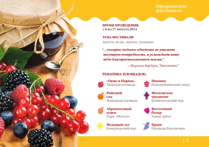 Специально для фестиваля подготовлен фирменный стиль и арт-объекты, огромные банки с вареньем, песочные скульптуры, которые украсят площадки фестиваля, оформленные дизайнерами каждая на свой вкус. В эти сладкие фестивальные дни можно будет прогуляться по «Райскому саду» или «Медовому лугу», загореть на «Абрикосовом пляже», сходить на «Пикник», «Московское чаепитие», «Восточный базар» или посетить площадку «Крым».