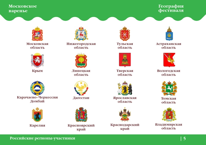 Фестиваль «Московское варенье» никого не оставит равнодушным. Здесь можно будет пройтись между ярмарочными шале, чтобы подобрать лакомство на свой вкус: мед, шоколад, чай, фрукты, повидло, мороженое, сироп и самое разное варенье. Из крымских фруктов, из каштанов и имбиря, из баклажана, лепестков роз, дикой ежевики, кактусов, апельсиновых корок, одуванчиков, сосновых шишек, оливок, белой черешни, черноплодного тута, тыквы, арбузных корок, грецкого ореха и даже из зеленых помидоров. Гостей ждет более тысячи кулинарных, спортивных и творческих мастер-классов, а также игра «Фруктовый квест», в которой смогут принять участие 20 тысяч человек. На фестивале можно будет научиться создавать ягодные натюрморты, варить не только варенье, но и фруктовое мыло, плести корзины для сбора ягод, разучивать танцы разных народов!