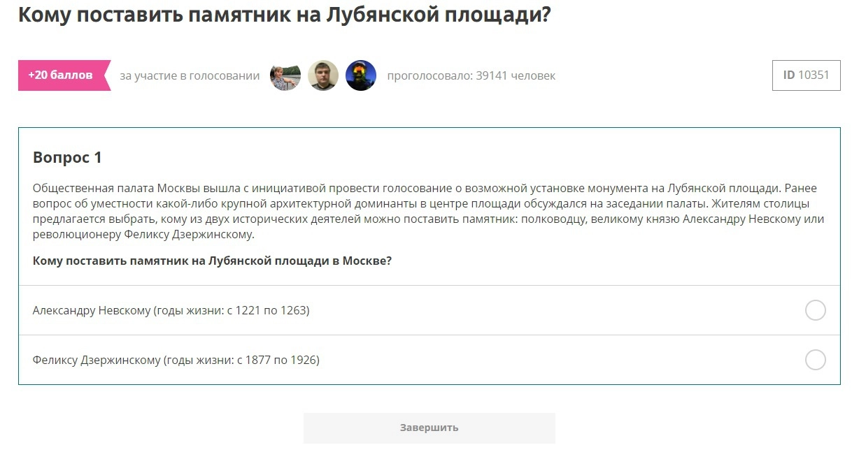 25 февраля на сайте правительства Москвы «Активный гражданин» началось голосование по инициативе Общественной палаты столицы о выборе памятника для установки на Лубянской площади. В нем уже приняли участие десятки тысяч горожан.
