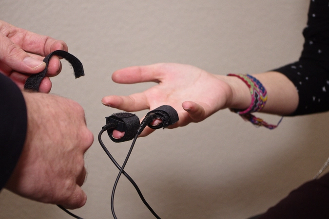 Датчики кожно-гальванического сопротивления измеряют потоотделение и крепятся на пальцы.