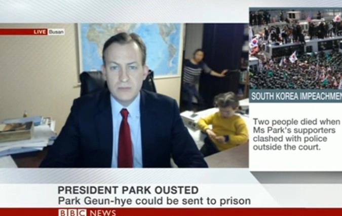 В прямом эфире BBC произошёл смешной конфуз. Корреспондент разговаривал с политическим экспертом по Южной Корее, доцентом Пусанского национального университета Робертом Келли, когда в комнату забежали маленькие дети и принялись играть возле.