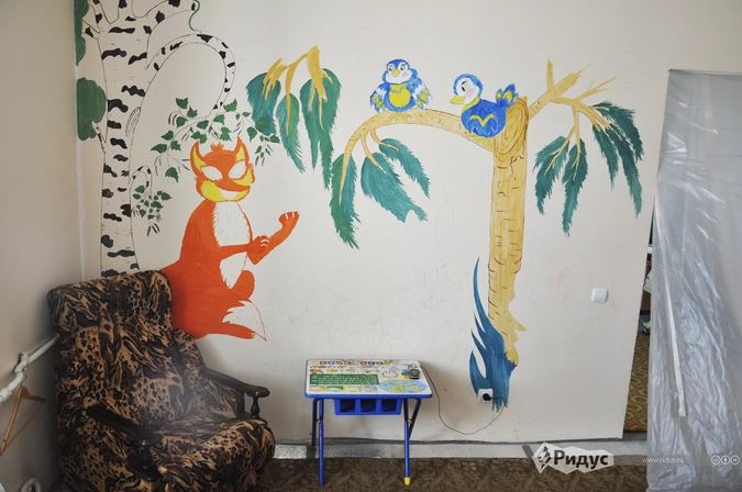 Ася Быкова кистью выводит на стене линии - делает фреску в детской комнате. Рисует просто так - малышню порадовать, но сюжет выдает подсознание беженки. Коварная лиса Порошенко хочет сцапать голубых птичек из Донбасса. Те не боятся: успели спрятаться на высоком дереве России.