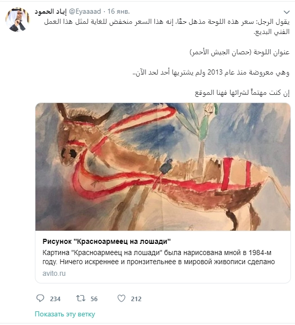 Москвич Владимир Мкртчян, выставивший на интернет-площадке «Авито» на продажу за 140 млн рублей свой детский рисунок «Красноармеец на лошади», заинтересовал им покупателей из стран Персидского залива.