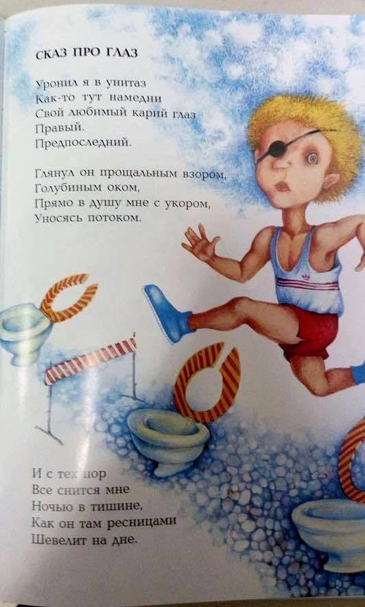 На конференции в Российской государственной детской библиотеке она обратила внимание на стихотворение Игоря Иртеньева про карий глаз, который упал в унитаз и там на дне шевелил ресницами.