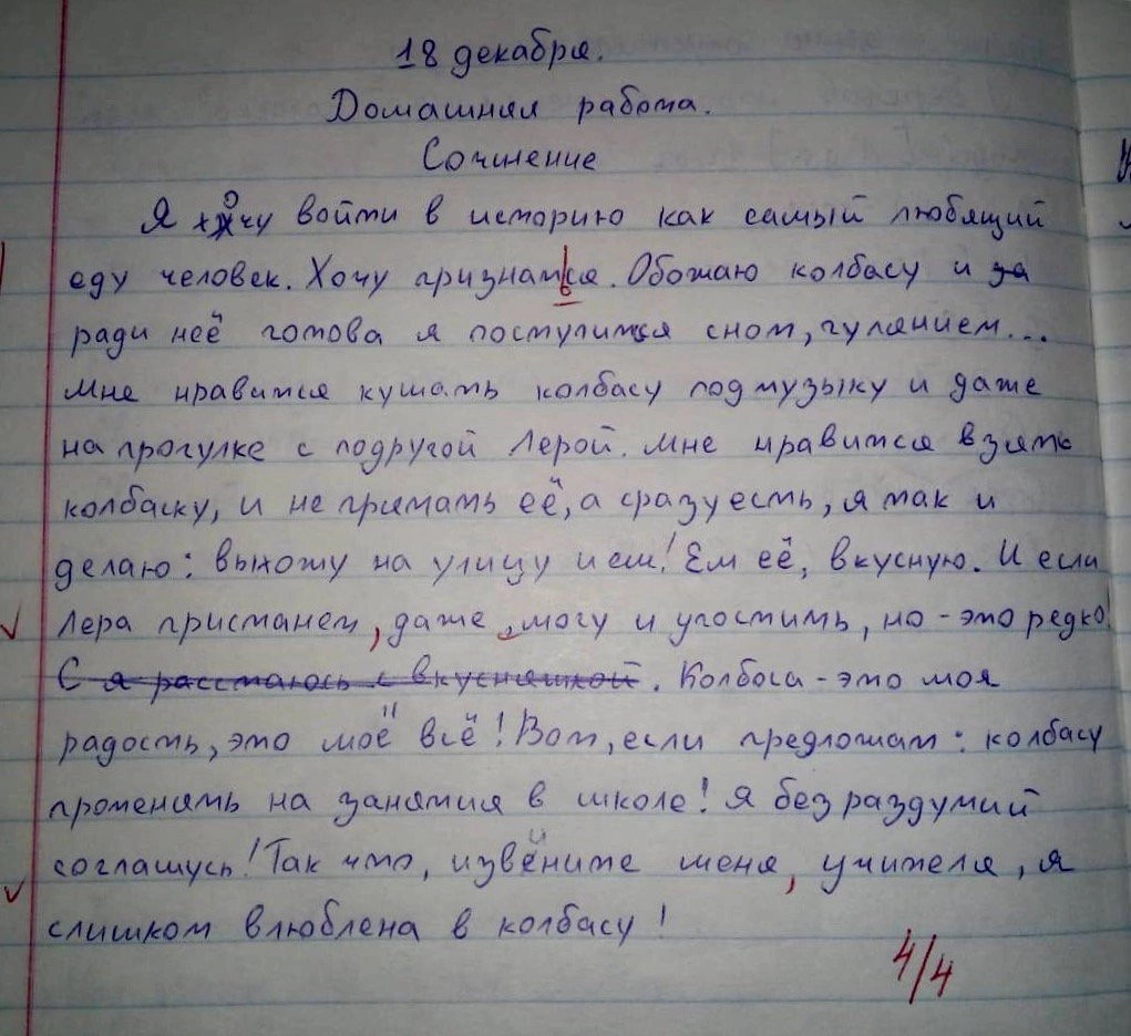 Обожаю колбасу и ради неё готова поступиться сном, гулянием… Мне нравится кушать колбасу под музыку и даже на прогулке с подругой Лерой. Мне нравится взять колбаску и не прятать её, а сразу есть, я так и делаю: выхожу на улицу и ем! Ем её, вкусную, — пишет неизвестная ученица.