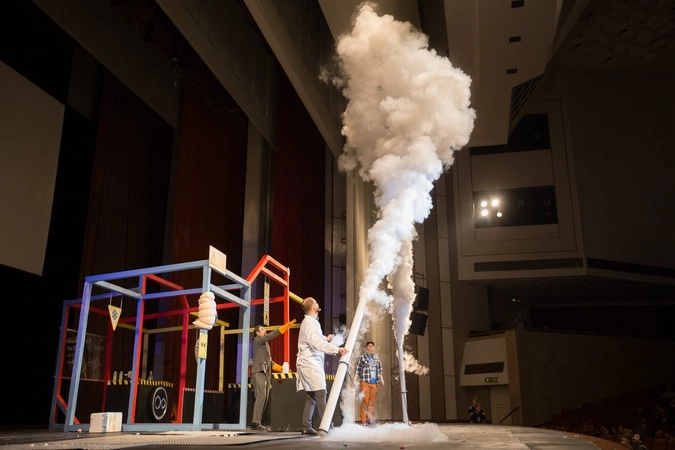Один из самых любимых и самых зрелищных опытов. Главное — не повторять его в домашних условиях! Берется литр жидкого азота и литр кипятка, азот расширяется в тысячу раз и выстреливает огромным столбом пара. Так на сцене РАН мы получаем свой собственный гейзер.