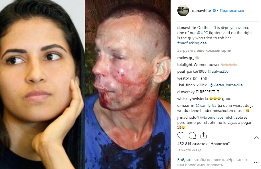 Девушка-боец UFC Полиана Виана разбила лицо мужчине, который пытался украсть у нее мобильный телефон. Глава UFC Дана Уайт опубликовал на своей странице в Instagram фотографию спортсменки и мужчины с окровавленным лицом.