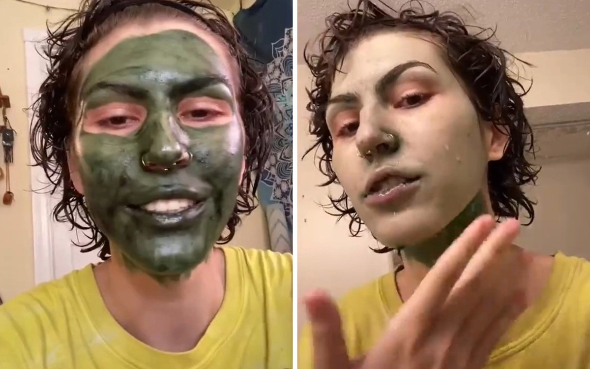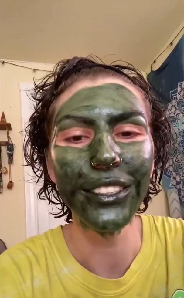 Девушка нанесла на лицо хлорофилловую маску, которая в последнее время пользуется большой популярностью среди тиктокеров