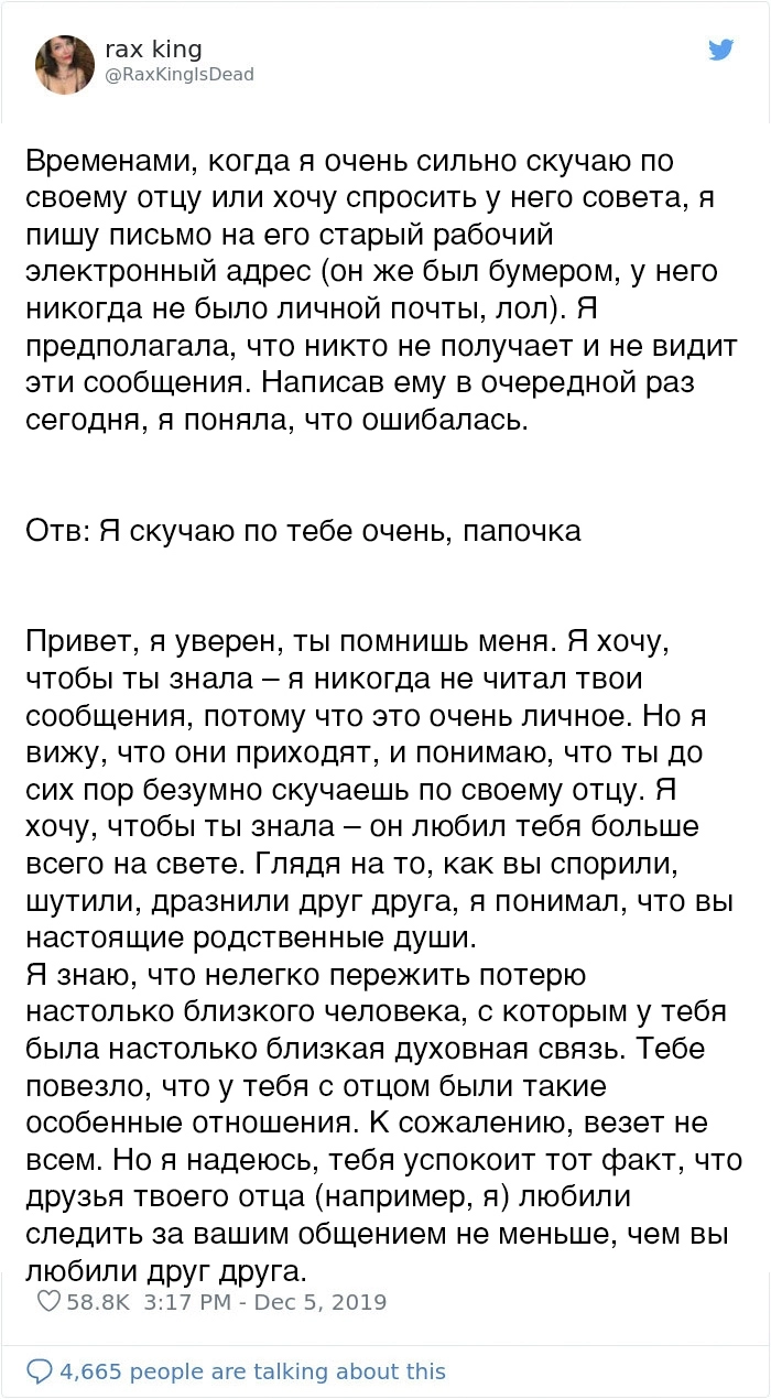 Ответ коллеги отца довел девушку до слез. Она поделилась своей историей в Twitter. Пост Ракс стал вирусным, набрав около 60 тысяч лайков. Многие люди в комментариях полностью разделили ее чувства: