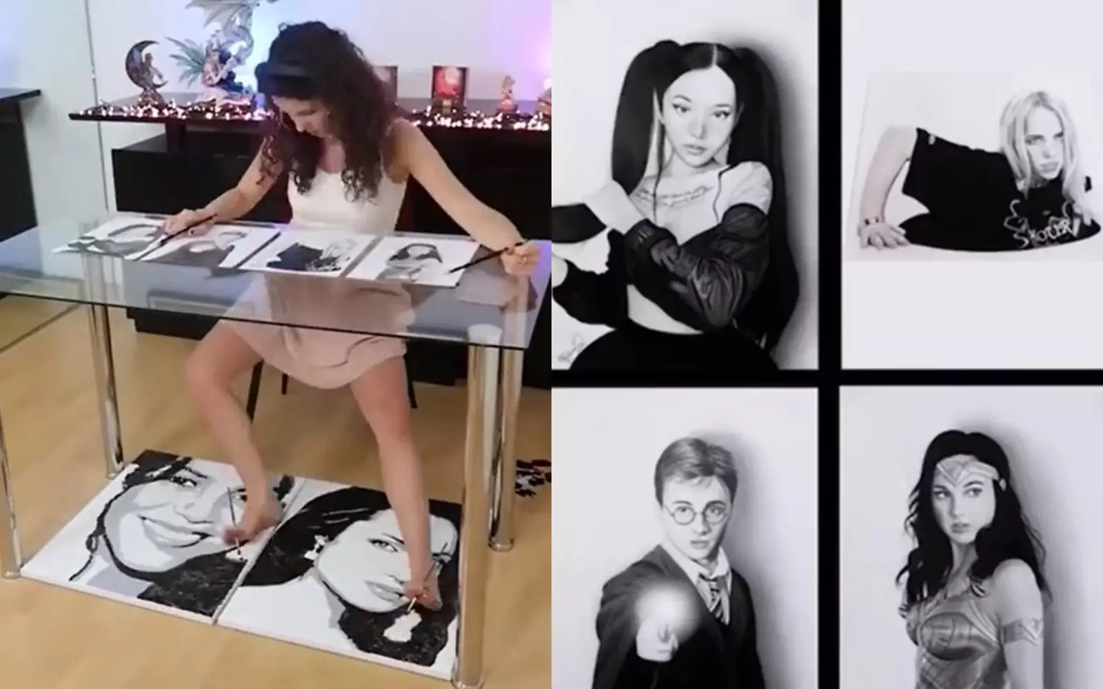 Девушка рисует потрясающие портреты, используя руки и ноги одновременно