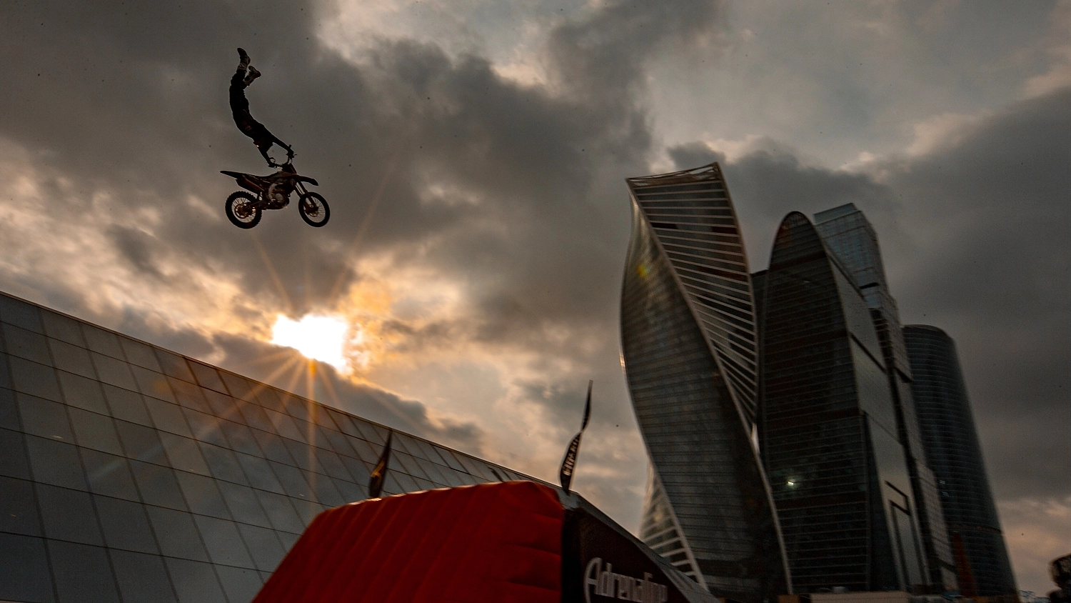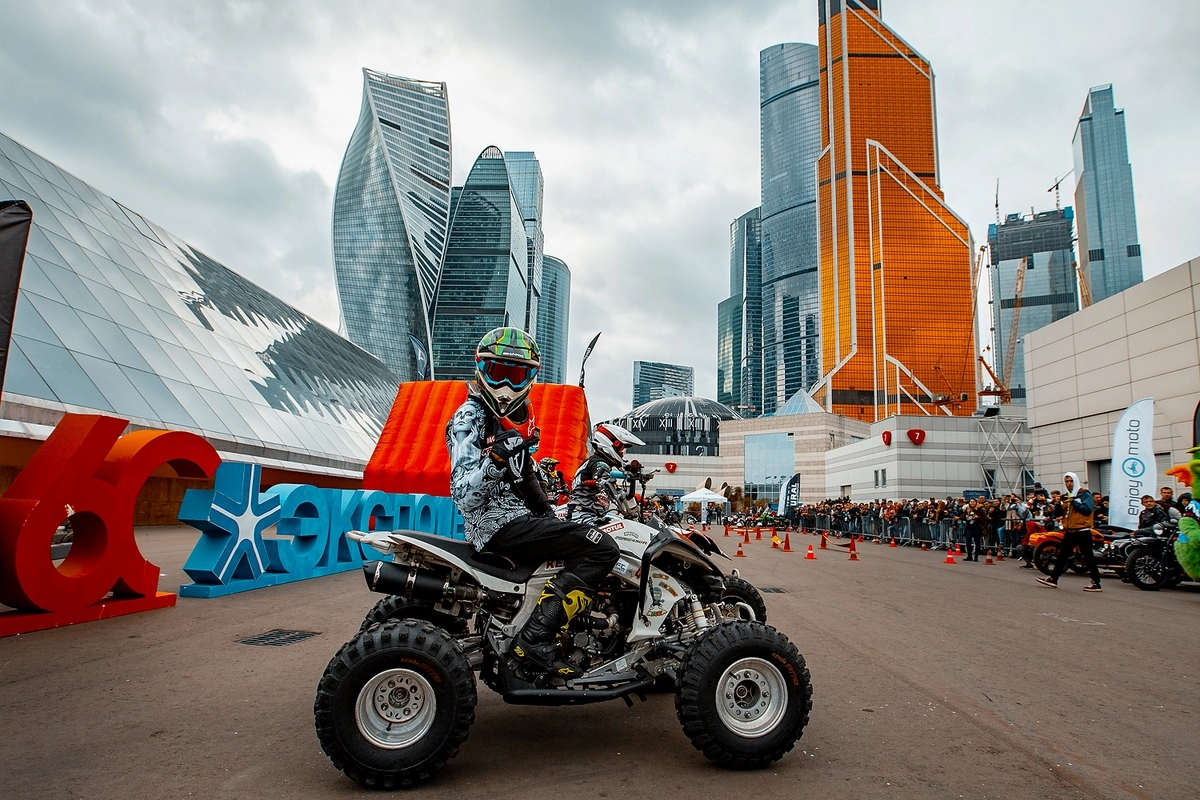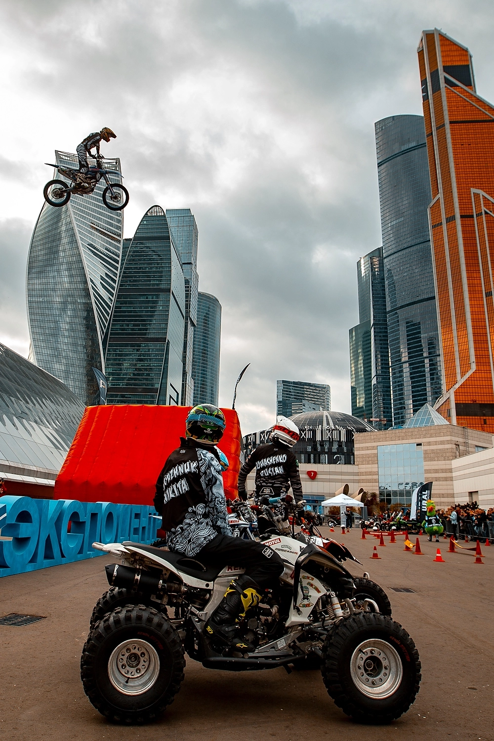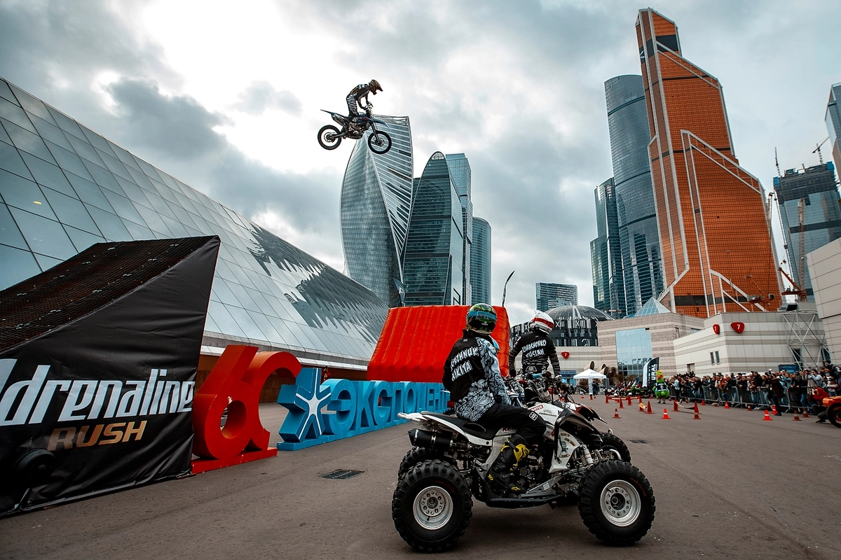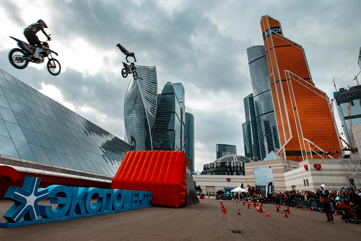 Уличная программа — обязательный элемент мотовыставок. В этот раз на площади «Экспоцентра» блистали летающие мотоциклисты из фристайл-команды Ferz FMX. Их трюки на фоне небоскрёбов Москвы-Сити смотрелись особенно эффектно.