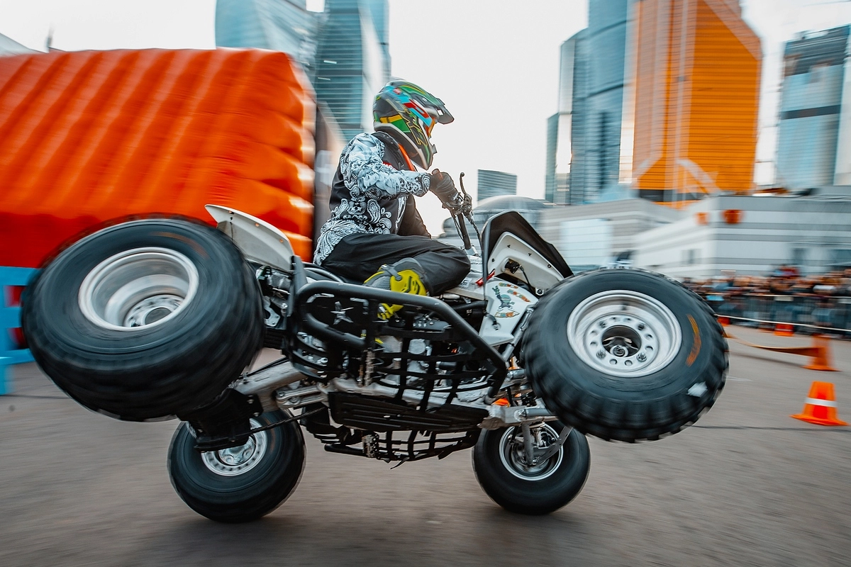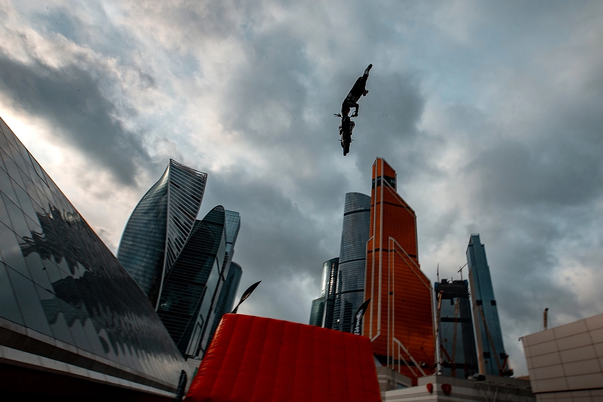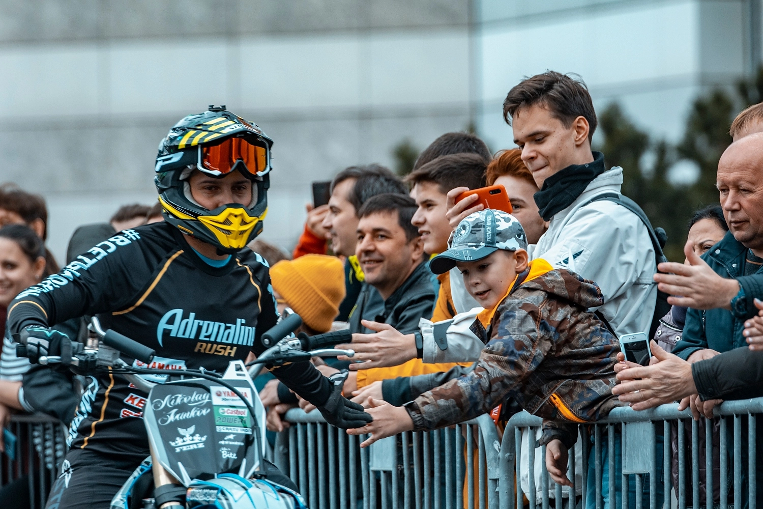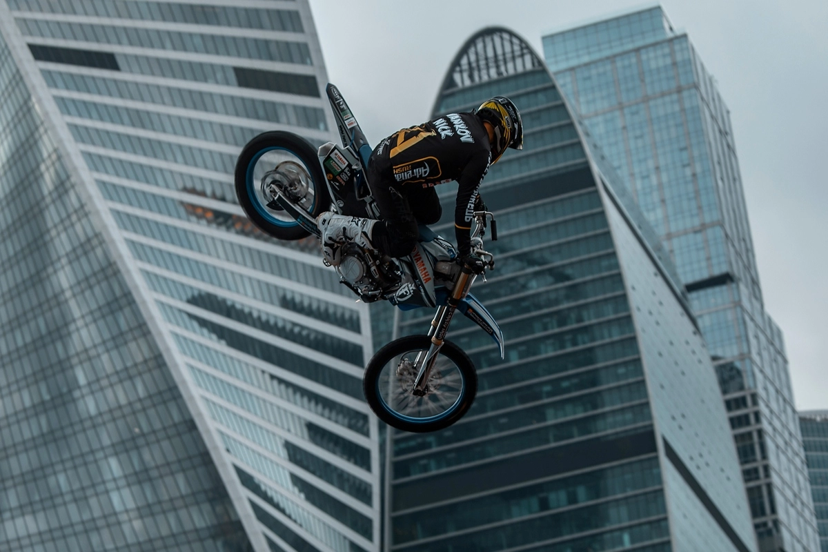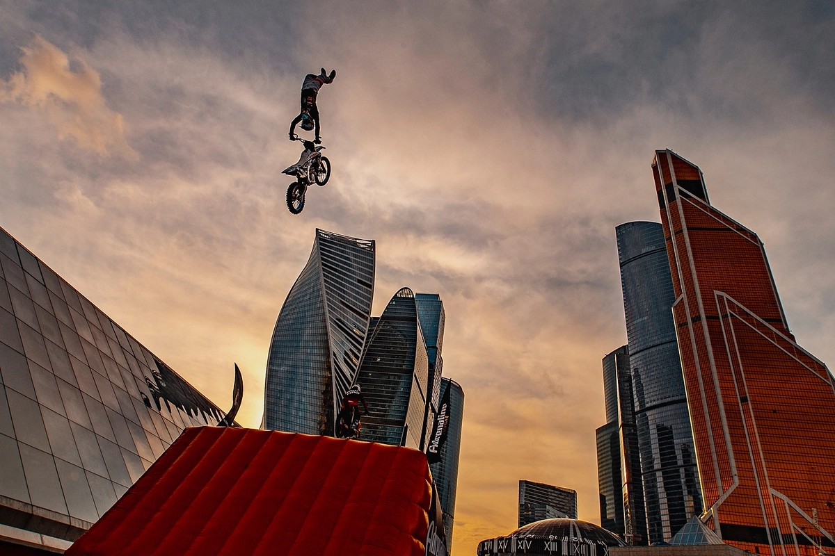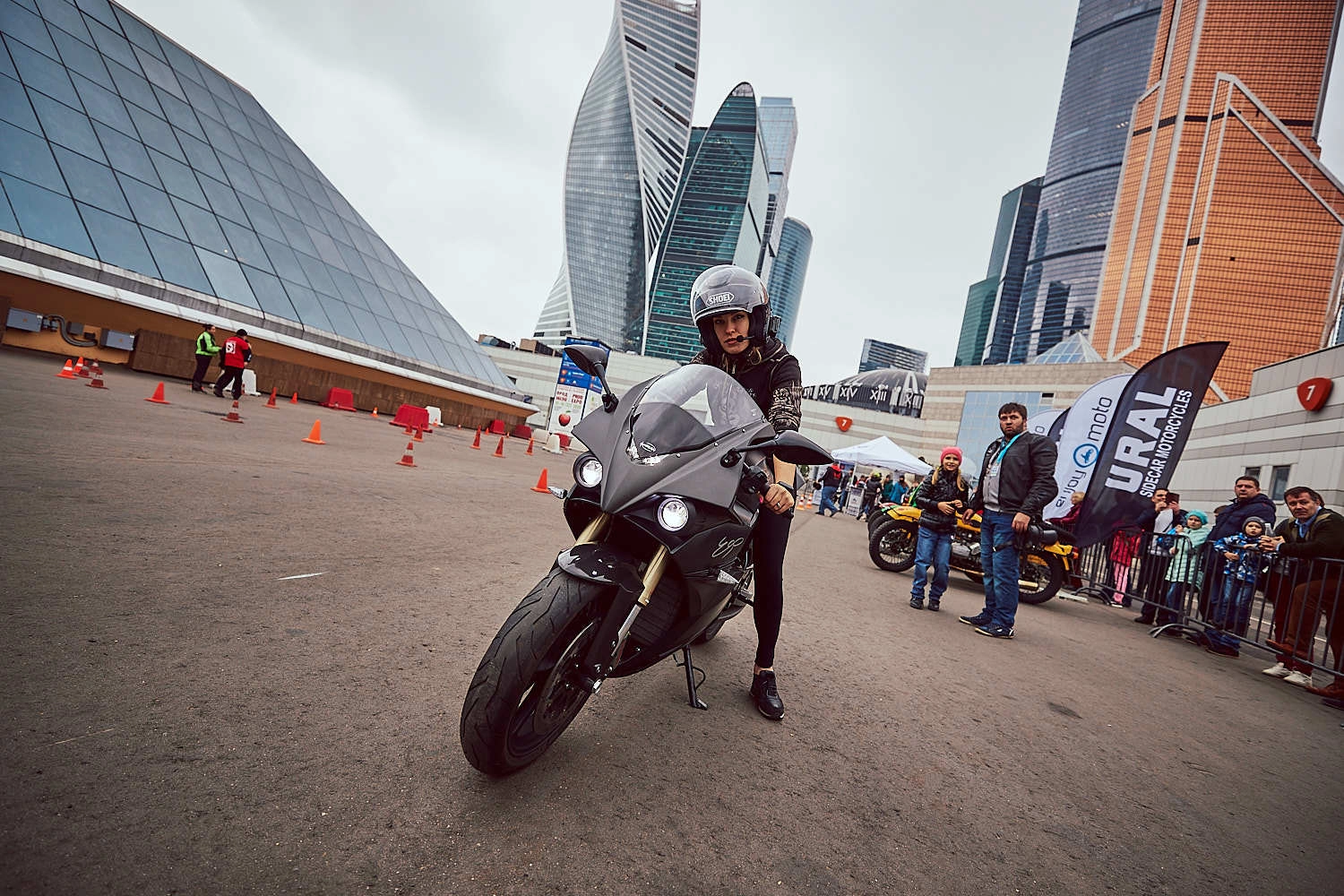 Уличная программа — обязательный элемент мотовыставок. В этот раз на площади «Экспоцентра» блистали летающие мотоциклисты из фристайл-команды Ferz FMX. Их трюки на фоне небоскрёбов Москвы-Сити смотрелись особенно эффектно.
