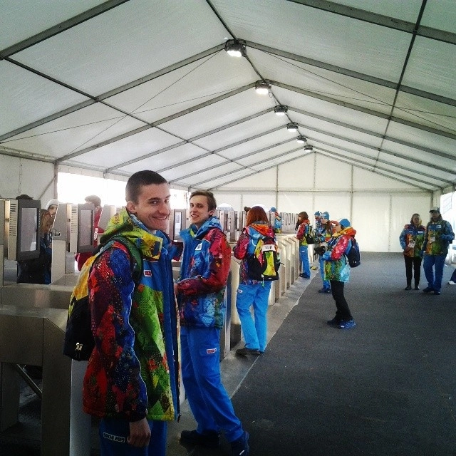 Всё дело в том, что для органов безопасности была пошита специальная олимпийская форма, по параметрам напоминавшая волонтёрскую. Отлична она была только цветом, он фиолетовый. Именно такие «спортивные» ребята проверяли гостей Олимпиады на входе на вокзал, дежурили вокруг стадионов и, время от времени даже ходили строем по Олимпийскому парку.
