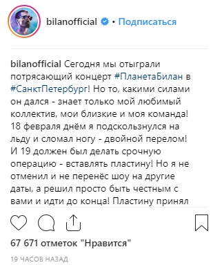 Сегодня мы отыграли потрясающий концерт! Но то, какими силами он дался — знает только мой любимый коллектив, мои близкие и моя команда! 18 февраля днем я подскользнулся на льду и сломал ногу — двойной перелом! — написал артист в Instagram.