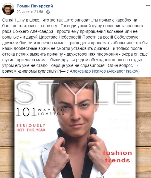 «Еще в воскресенье он шутил, приехала мама, рядом были друзья, обсуждали планы на отдых. А утром его уже не стало — сердце не справилось… Один вопрос к врачам — дипломы куплены?» — написал Печерский.