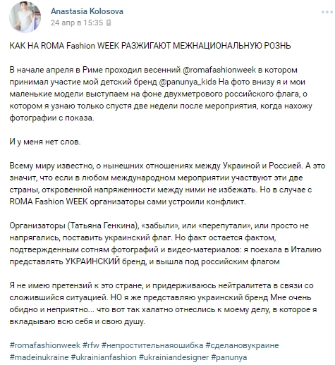 Сегодня Анастасия Колосова требует от организаторов Недели моды в Риме извиниться свою ошибку и опубликовать опровержение. Однако, как сообщает телеканал, они лишь предложили исправить флаг на фото с помощью редактора изображений.