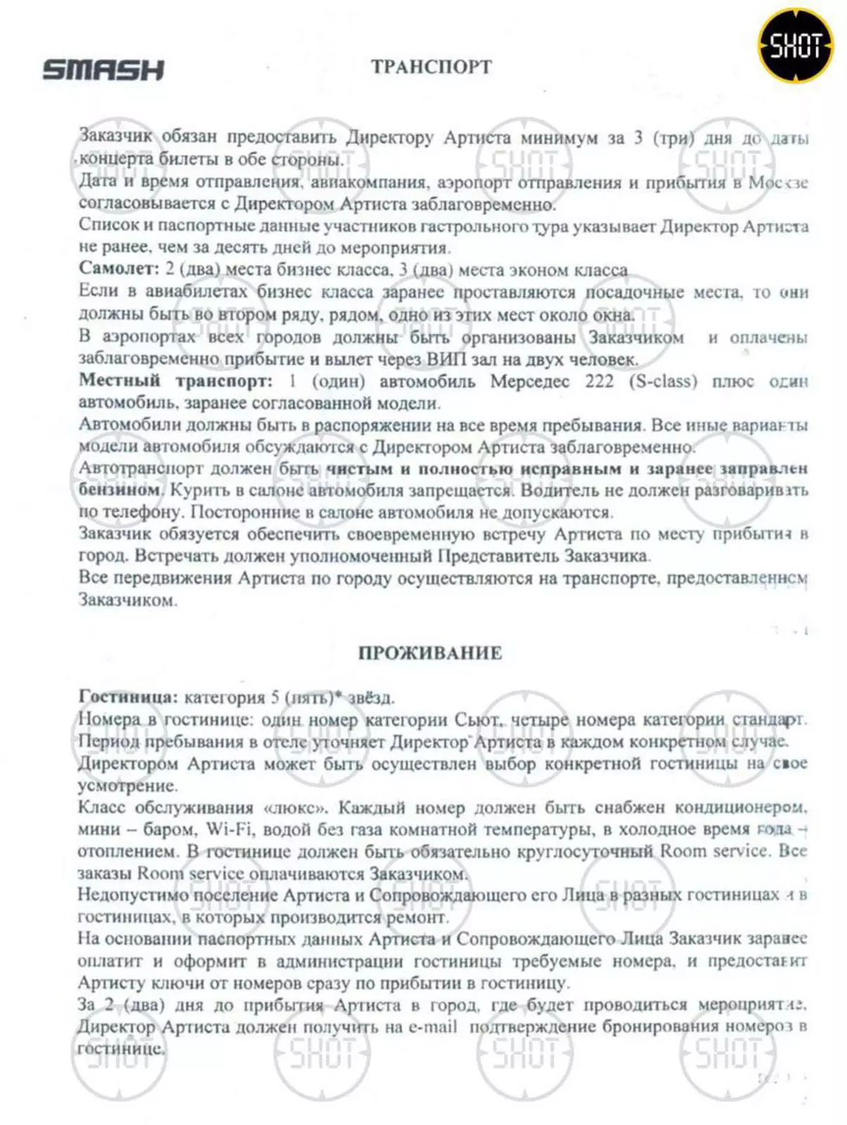 В райдер музыканта входили люкс в пятизвездочном отеле, питание в ресторане премиум-класса с русской или итальянской кухней, безалкогольные и алкогольные напитки без ограничений за счет заказчика, а также обязательное наличие в гримерной вина выдержки больше восьми лет, закусок и кальяна.