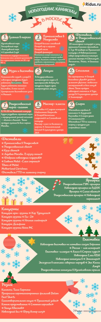 Если вы еще не нагулялись, или наоборот, только-только восстали из пепла после застолий и возлияний, то стоит сходить в музей, большинство из них в новогодние праздники будут работать бесплатно. Конечно, это еще не все — гораздо больше информации вы найдете в инфографике «Ридуса». И не забудьте как следует подготовиться к Рождеству.