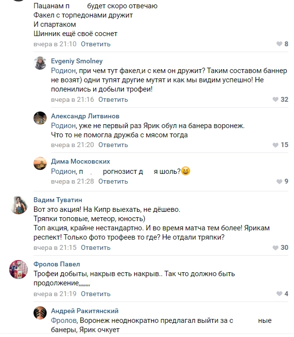 Как сообщают в сообществе Ultras Action, менее 20 ярославских хулиганов «накрыли» примерно такой же по численности состав приехавших на матч в Пафосе фанатов из Воронежа и Екатаринбурга, избили их и отняли клубные баннеры. Дальнейшее обсуждение инцидента в комментариях показало, что речь идет о давнем противостоянии болельщиков из этих городов.