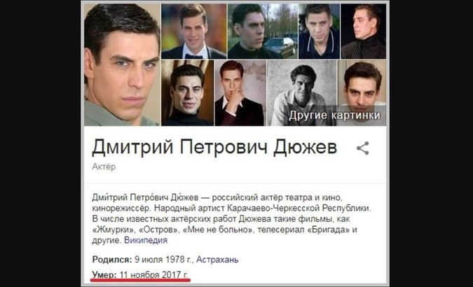 Как пояснили радиостанции «Говорит Москва» кураторы русской версии сайта, информация о смерти Дмитрия Дюжева уже удалена, однако Google в некоторых случаях продолжает выдавать дату смерти 11 ноября 2017 года, но и эта проблема носит временный характер.