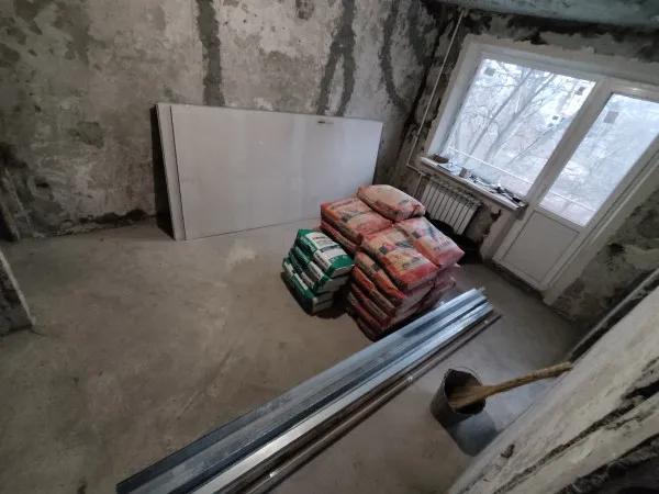 В анонсе к этому тексту выше на фото — 5 февраля 2021 года. День, когда я завезла стройматериалы для ремонта хрущевочки. Что там? 10 мешков Ротбанда, 2 мешка Перлфикса, гипсокартон, металлические профили, уголки, сетка штукатурная. Скромненько так… Пол прикрыт старыми одеялами. Заметили? Это я так пыталась сохранить советский паркет.