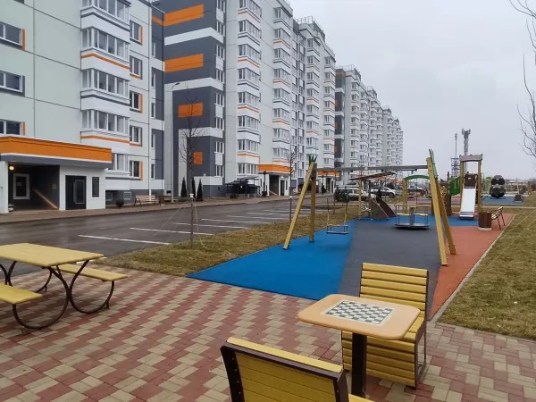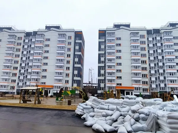 Придомовую территорию тоже благоустраивают. Уже высажены сосны, туи и можжевельники, есть детские и спортивные площадки, даже столик для любителей игры в шахматы установили. Парковочных мест много, мусорные контейнеры огорожены, то есть они не будут портить внешний вид микрорайона.