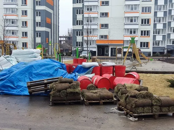 Вот на первом плане рулонные газоны, ими постепенно выстилают палисадники.