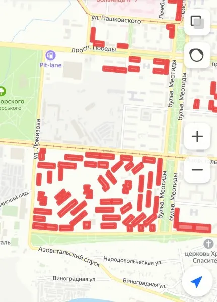 Во-первых, много домов сносят, порой целыми кварталами. Вот, например, на карте красным выделен квартал, где заканчивают сносить последние дома.
