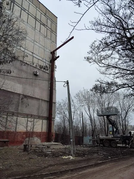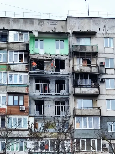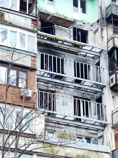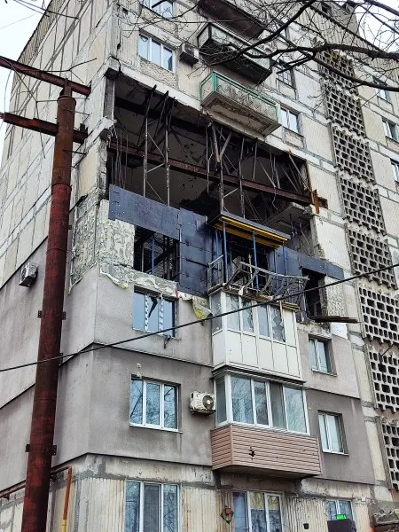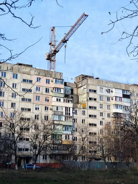 А это девятиэтажка по бульвару Шевченко. Здесь было прямое попадание в средние этажи. Оказывается, даже с такими разрушениями дом не безнадежен. То, что я здесь вижу, для меня из области невероятного. Верхние этажи поддомкрачены специальной конструкцией, и снизу строители уже начали заливать фасадные стены.