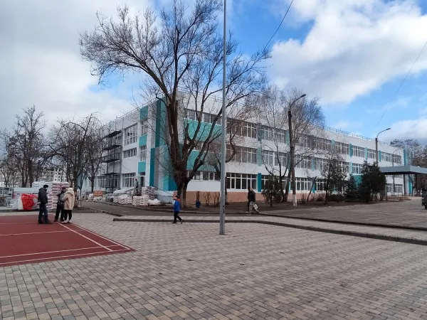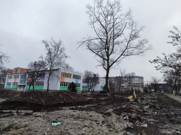 Фасад очень контрастирует на фоне окружающих домов. В том, прежнем Мариуполе и детские сады, и школы были серенькими и невзрачными. Теперь будет иначе, в город подвезли яркие краски!