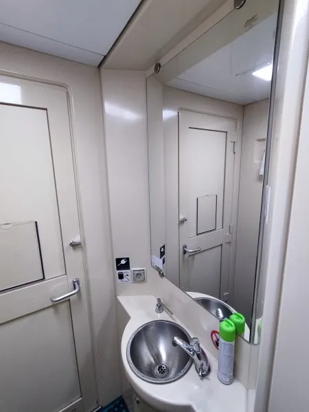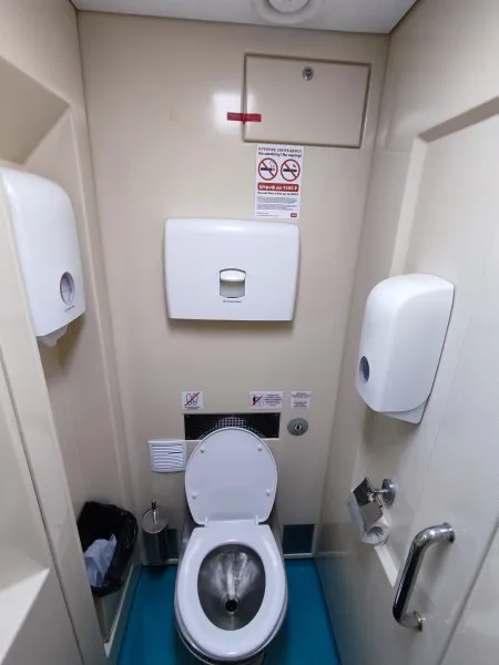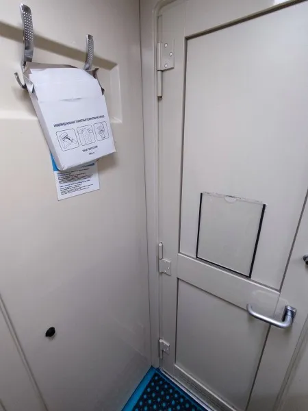 В комплекте с бельем нашлось белоснежное полотенце, и у меня впервые не возникло сомнений насчёт того, стоит ли воспользоваться им. Кстати, это был первый туалет в поезде, в котором не было противно находиться. Никаких неприятных запахов, луж на полу, незакрывающихся дверей, бумага (в том числе и сменные накладки на унитаз), мыло в диспенсере — пожалуйста! Более того, туалетами можно пользоваться даже во время стоянок. Санитарные зоны и педалька, на которую нажмёшь и увидишь шпалы, в прошлом.