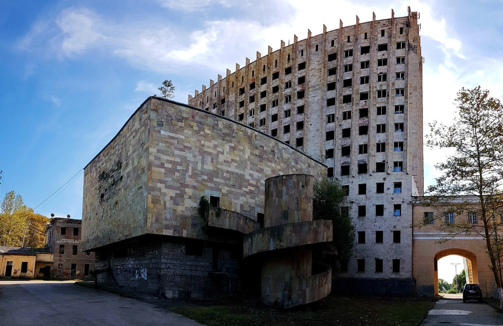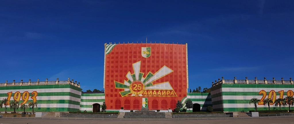 Если российский Белый дом восстановили в кратчайшие сроки (напомню, в очень трудные для страны времена), то его абхазский коллега и по сей день радует любителей заброшек, псевдосталкеров, алкашей и наркоманов, а также любителей бесплатных общественных туалетов. Грёбаный стыд лишь прикрыли торжественным транспарантом, как символом происходящего абсурда.