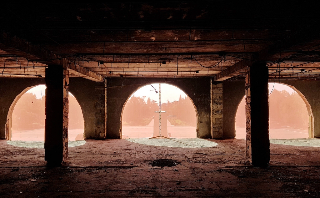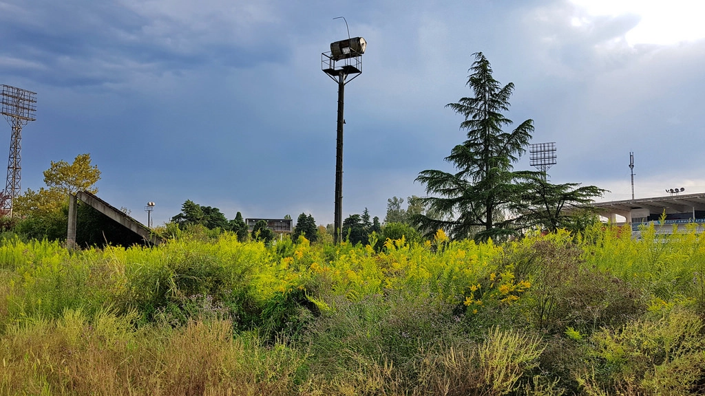 Поначалу подумал, что он тоже заброшен. Из кафе, устроившегося прямо на территории, доносятся громкая музыка и пьяные крики, всё же юбилей независимости от порядка. Буйная растительность почти скрывает трибуну, сквозь которую уже пробиваются молодые деревца.