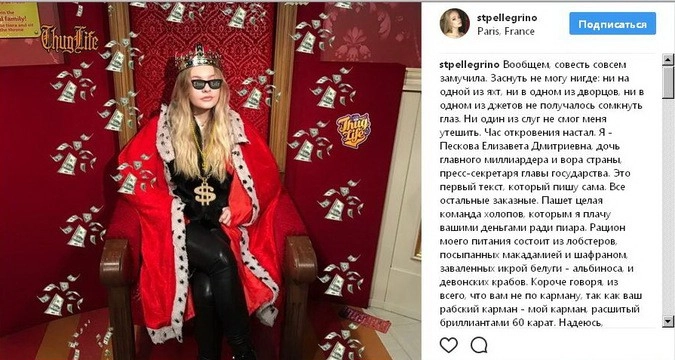 «Час откровения настал. Я — Пескова Елизавета Дмитриевна, дочь главного миллиардера и вора страны, пресс-секретаря главы государства. Это первый текст, который пишу сама. Все остальные заказные. Пашет целая команда холопов, которым я плачу вашими деньгами ради пиара», — с первых строк ошарашивает читателей девушка.