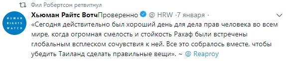 Сегодня действительно был хороший день для защиты прав человека во всем мире, когда огромная смелость и стойкость Рахаф были встречены глобальным всплеском сочувствия к ней. Все это дало результат и помогло убедить Таиланд поступить правильно, — написал он в соцсети.