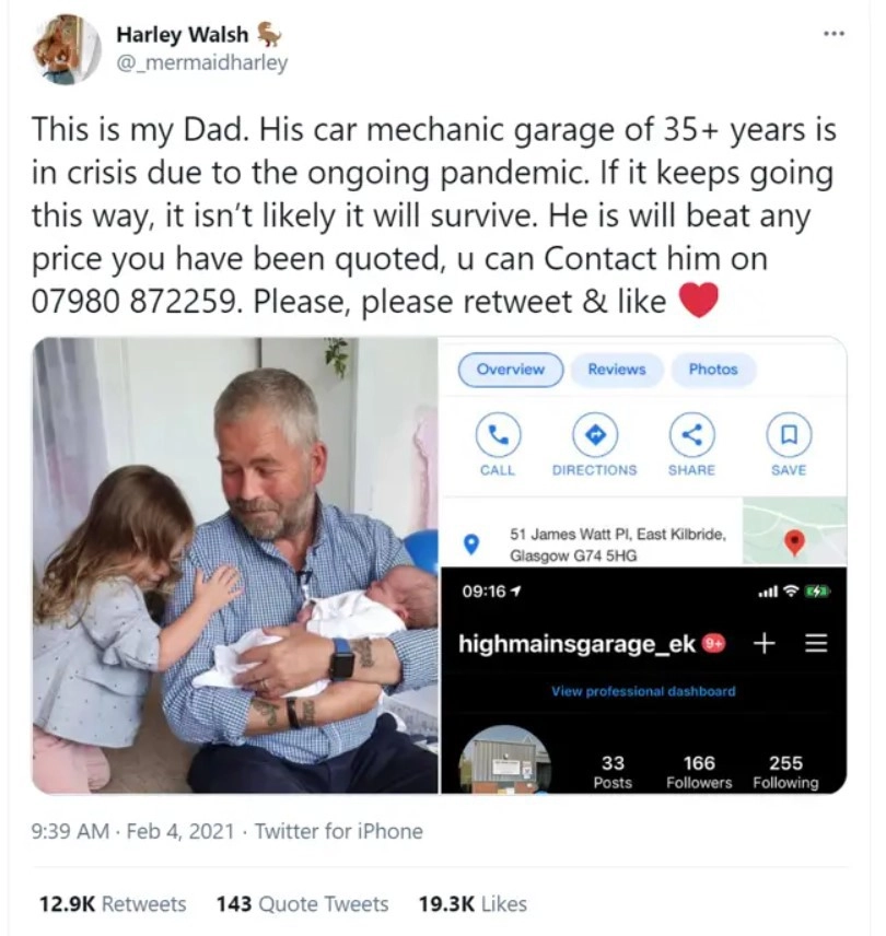 Жительница Шотландии — Харли Уолш очень беспокоилась за отца, чей бизнес сильно пострадал из-за пандемии коронавируса. Папа девушки по имени Джим — отличный механик и владеет собственной автомастерской.